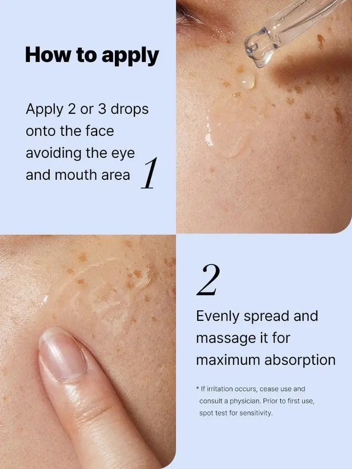 Après le nettoyage, pendant la phase du sérum, appliquez quelques gouttes sur la peau. Utilisez le bout des doigts pour masser doucement et faire absorber le sérum, en commençant du centre du visage vers les bords.