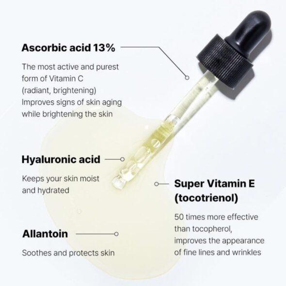 Eau, Acide Ascorbique (13 %), Butylène Glycol, Dipropylène Glycol, Trométhamine, Acide 3-O-Éthyl Ascorbique, Panthénol, Acétyl Glucosamine, Caféine, Hyaluronate de Sodium, Sulfite de Sodium, Édétate Disodique, Glutathion, Adénosine, Extrait de Fruit de Gardenia Florida, Allantoïne, Dextrine, Squalane, Tocotriénols, Tocophérol, Huile de Palme Elaeis Guineensis, Arginine, Niacinamide, Pentylène Glycol, Extrait de Racine de Glycyrrhiza Glabra (Réglisse).